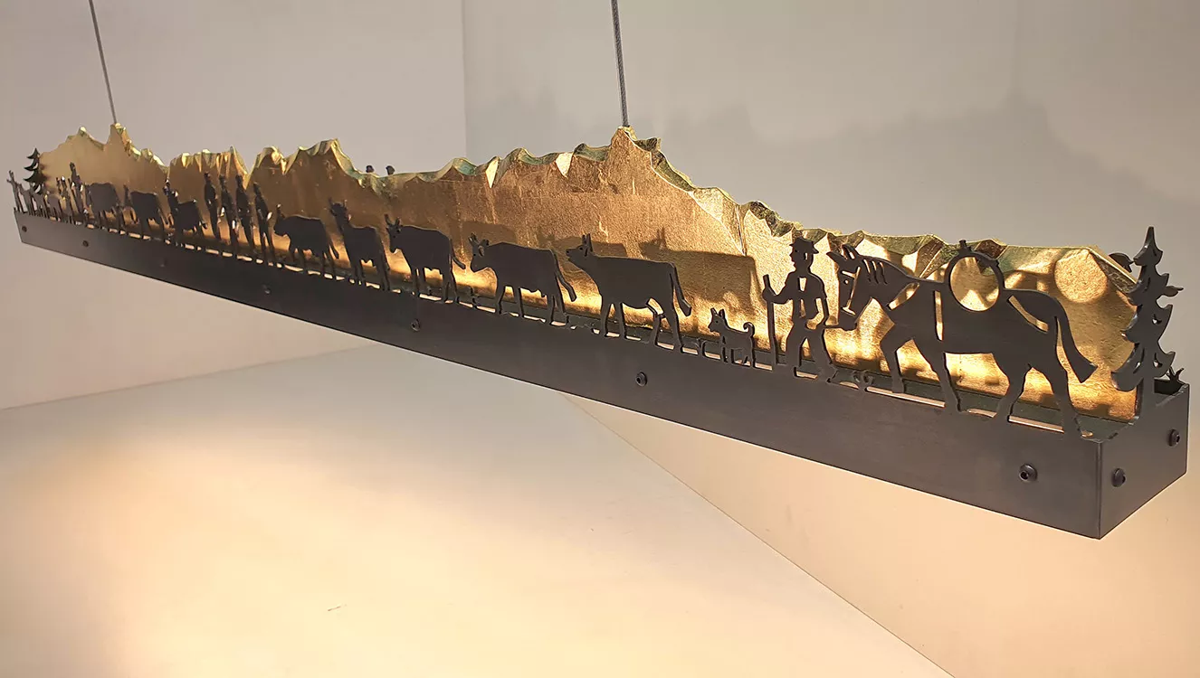 Unsere Metalllampen verbinden traditionelles Handwerk mit modernem Design und schaffen eine warme, stimmungsvolle Atmosphäre. Ob Deckenlampen, Säulenlampen oder Dekolampen – wählen Sie aus einzigartigen Motiven wie der Silhouette des Alpsteins oder dem Alpaufzug.